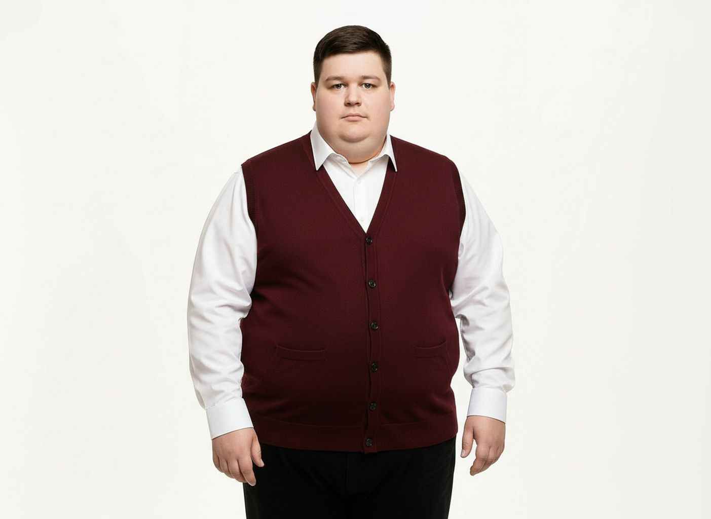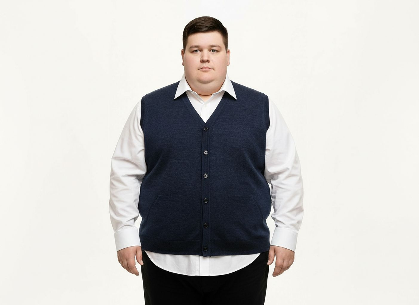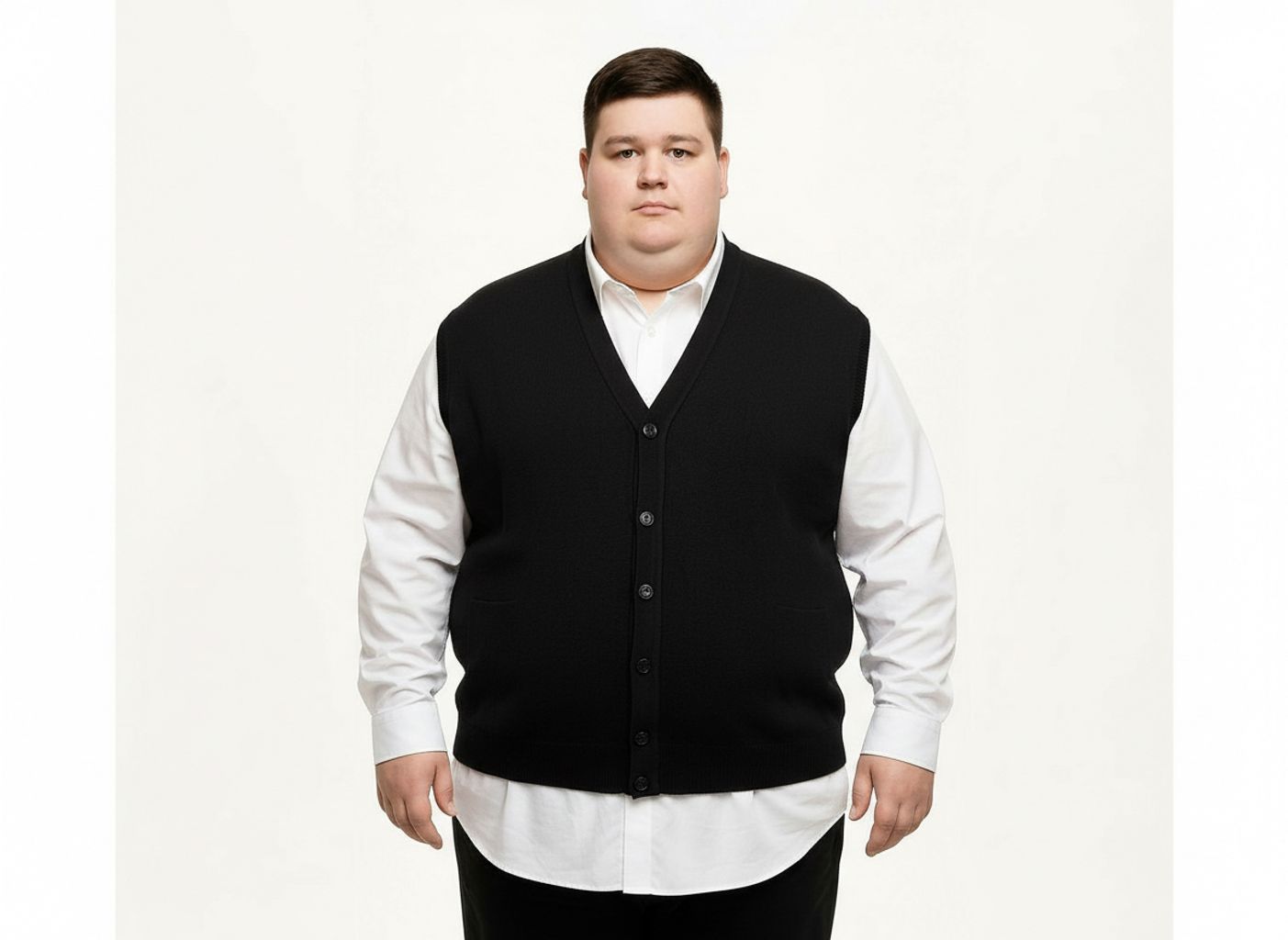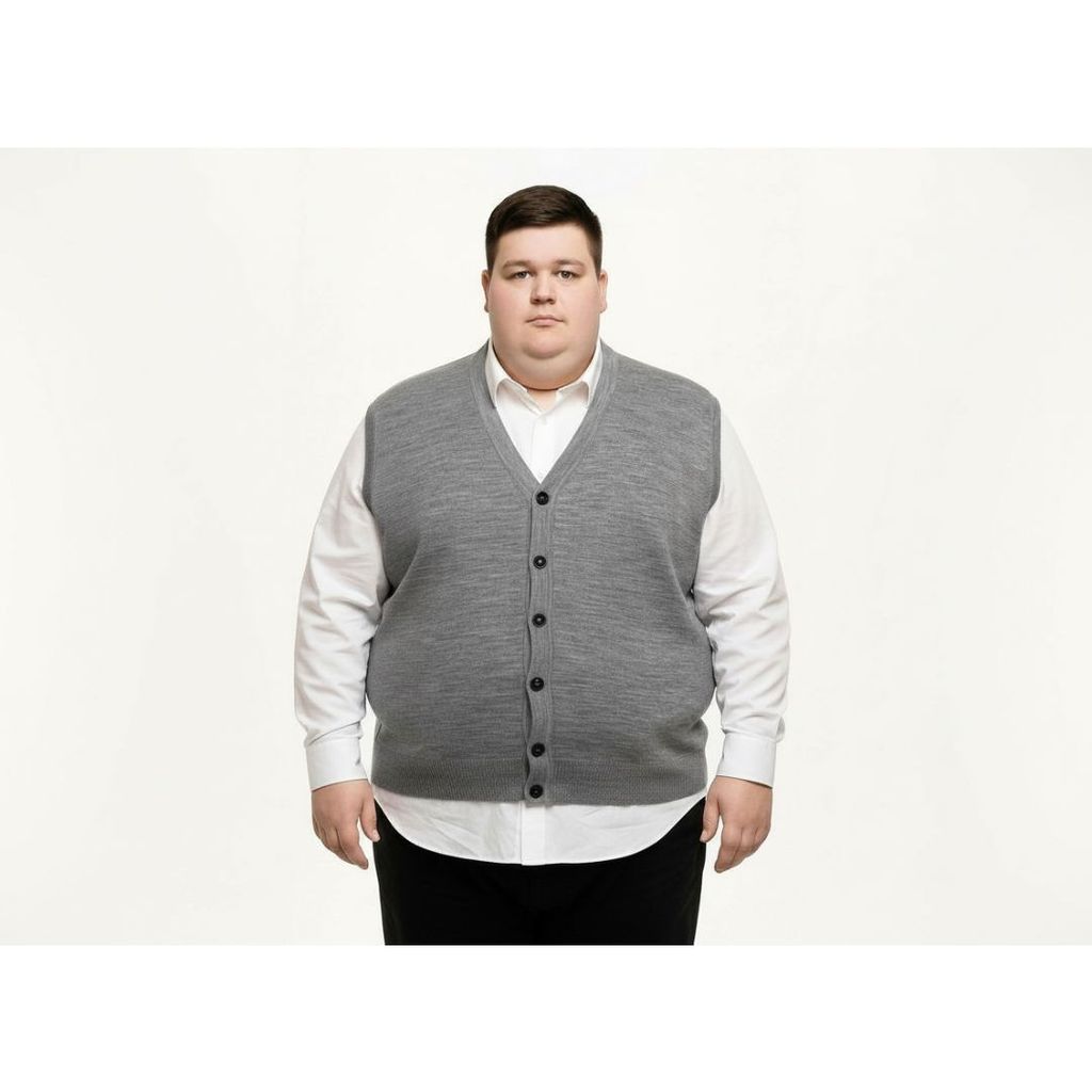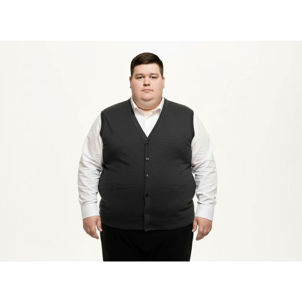 Antrasit renkli, düğmeli triko erkek yelek. 3XL’den 6XL’ye kadar geniş beden aralığıyla rahat kalıp. %50 yün, %50 akrilik karışımıyla sıcak ve konforlu.