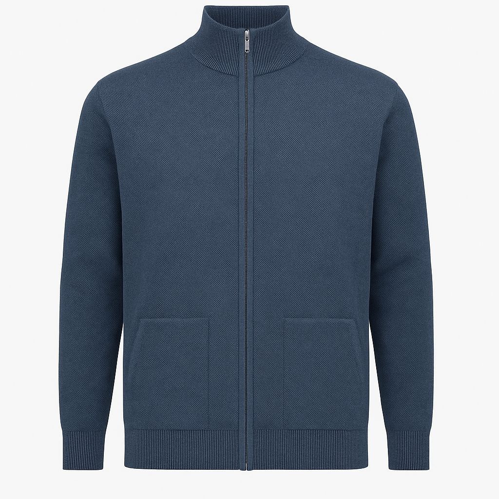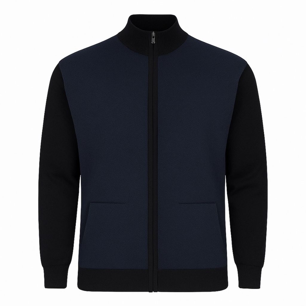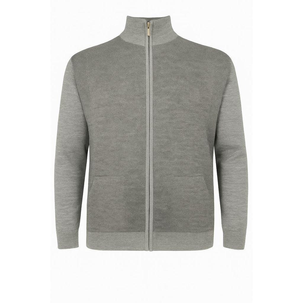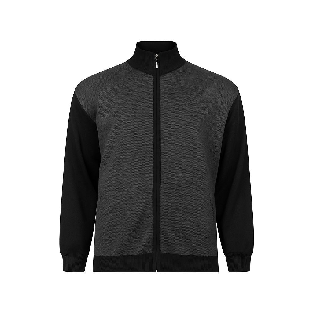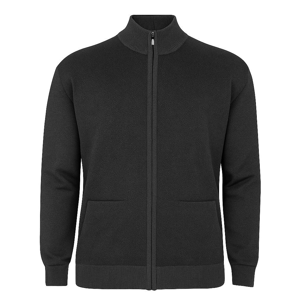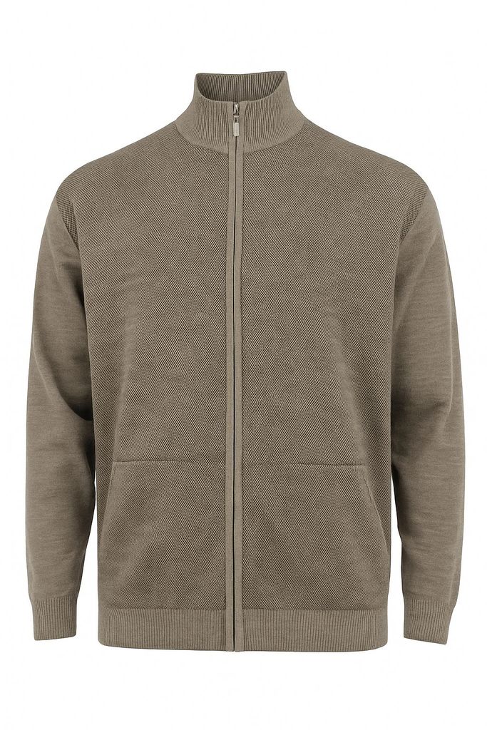 %50 yün %50 akrilik karışımlı, tam fermuarlı, dik yaka triko hırka. 530 gram ağırlığında, sıcak tutan ve battal beden erkekler için özel olarak üretilmiştir.