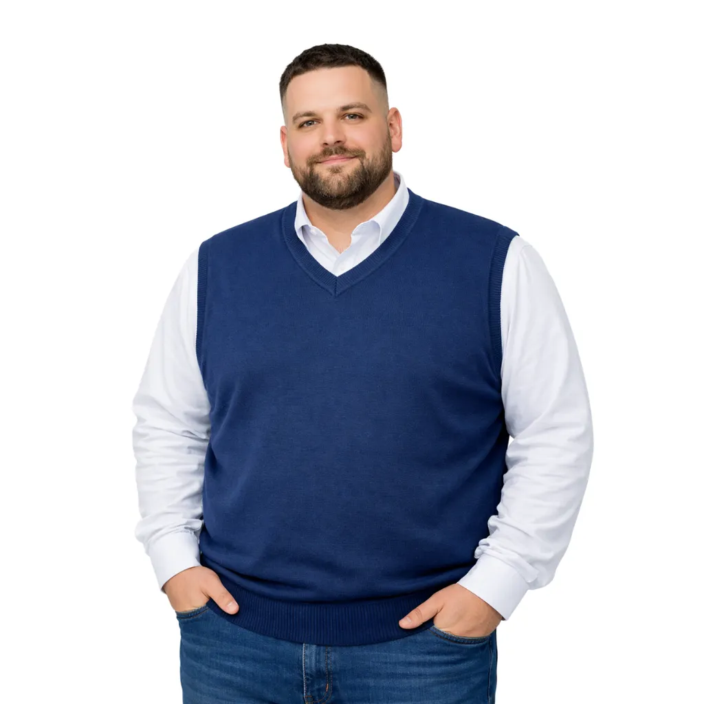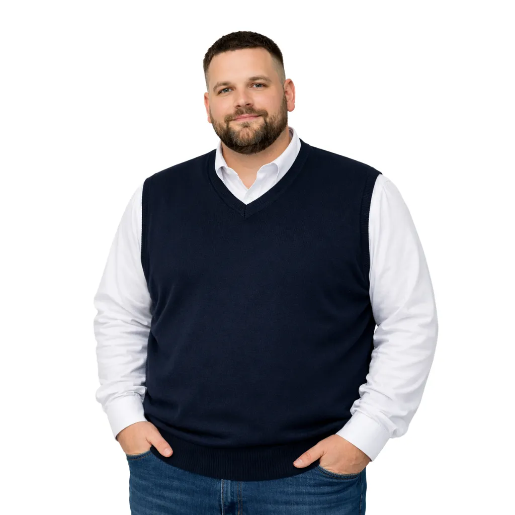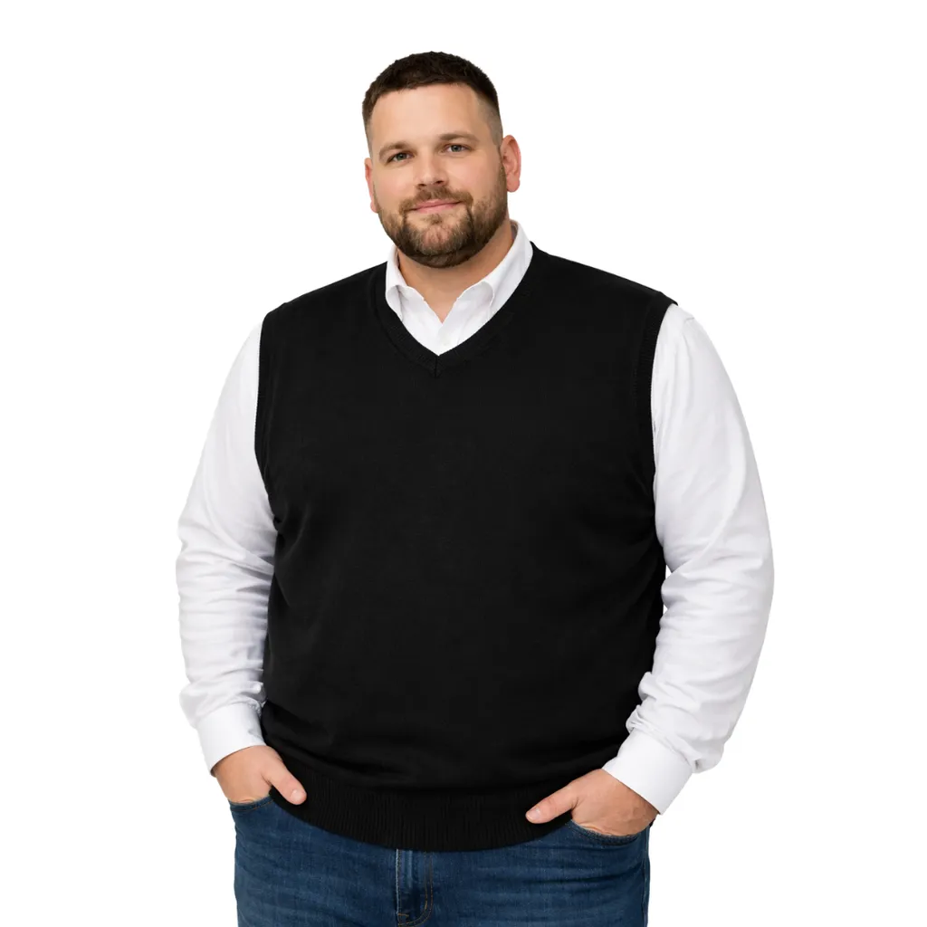 Erkek büyük beden V yaka triko süveter. Yumuşak dokulu, %50 yün %50 akrilik karışımı ile sıcak tutar, konforlu ve şık bir görünüm sunar.