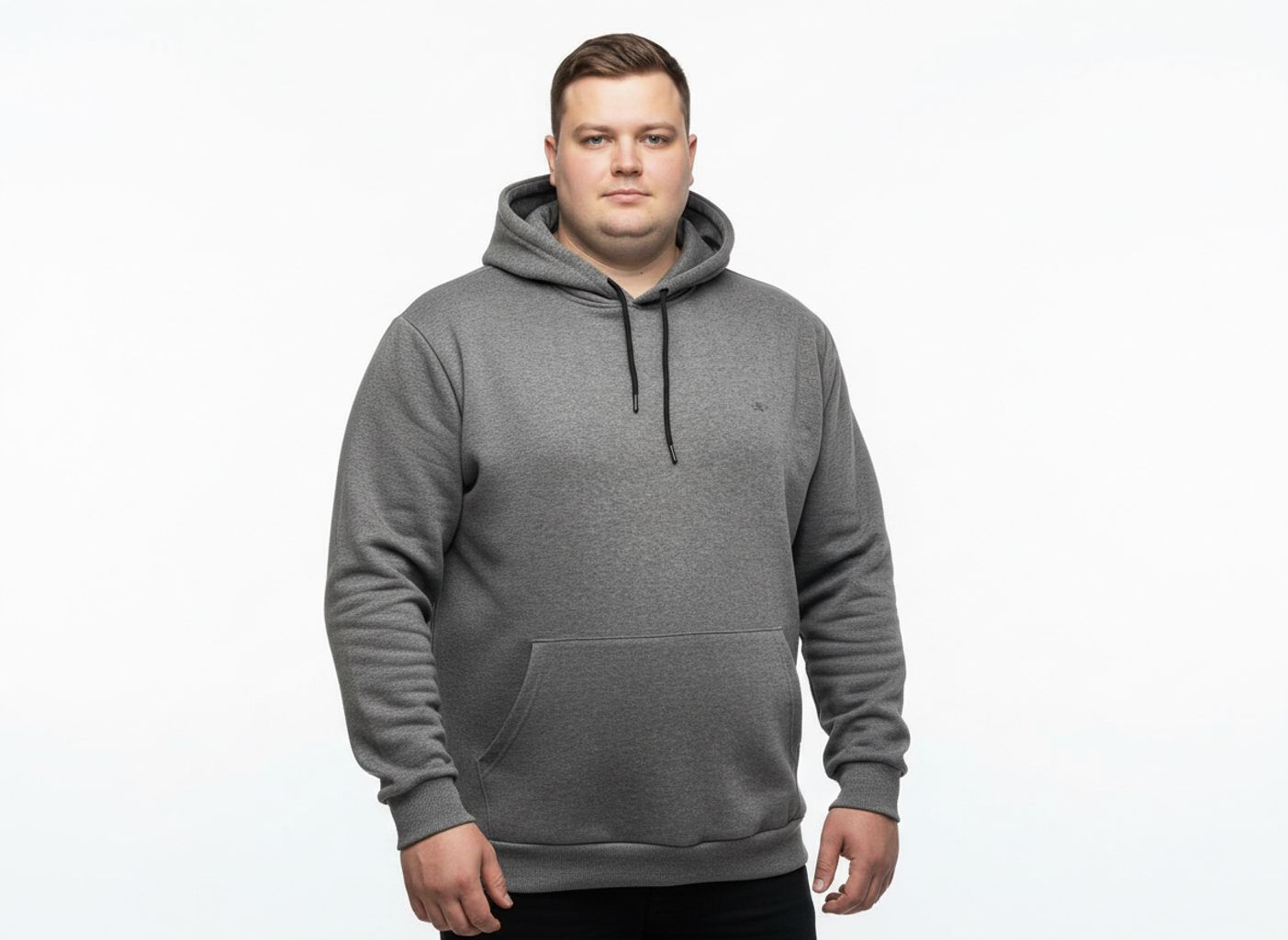 %95 pamuk, %5 likralı iki iplik kumaştan üretilmiş büyük beden kapüşonlu sweatshirt. Yumuşak dokusu, kanguru cebi ve sade tasarımıyla konforlu bir görünüm sunar.